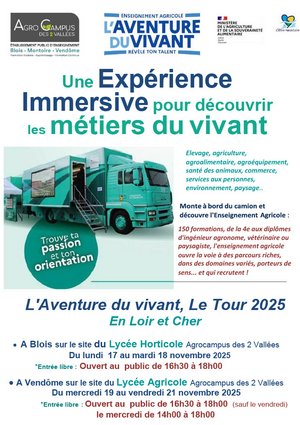 Le camion de l'aventure du vivant sera présent à l’Agro Campus des 2 Vallées sur le site du LPH de Blois du lundi17 au mardi 18 novembre et sur le site du LEGTA de Vendôme du mercredi 19 novembre au vendredi 21 novembre 2025. Les métiers du vivant ce sont plus de 150 métiers !