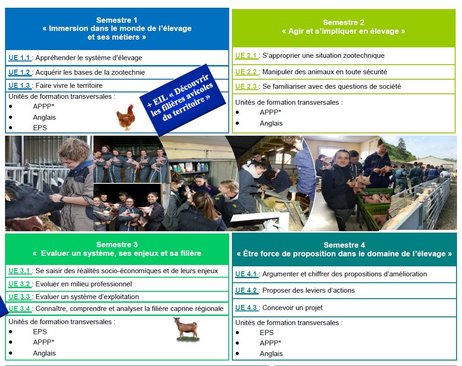 - de connaissances techniques de niveau professionnel (Economie et politiques des Productions Animales, Fonctionnement de l'exploitation, Activités d'élevage et environnement, Biologie et Biochimie appliquée aux productions animales, Technologies générales et comparées des productions animales, reproduction, alimentation, sélection génétique, santé, croissance et développement et enfin de nombreux Travaux Pratiques : appréciations, manipulations et interventions sur les animaux, conduite d’élevage porcin, bovin laitier, ovin viande et gestion des surfaces fourragères)